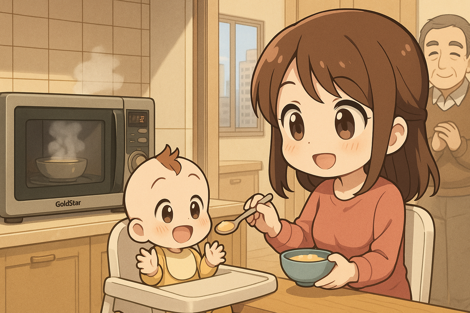 이제 전자렌지에서 꺼낸 이유식을 아기에게 떠먹인다. 잘 데워진 한 숟가락을 받아먹는 아기의 따뜻한 표정은, 이 오래된 기계가 오늘도 우리에게 건네준 작은 기적이다.
