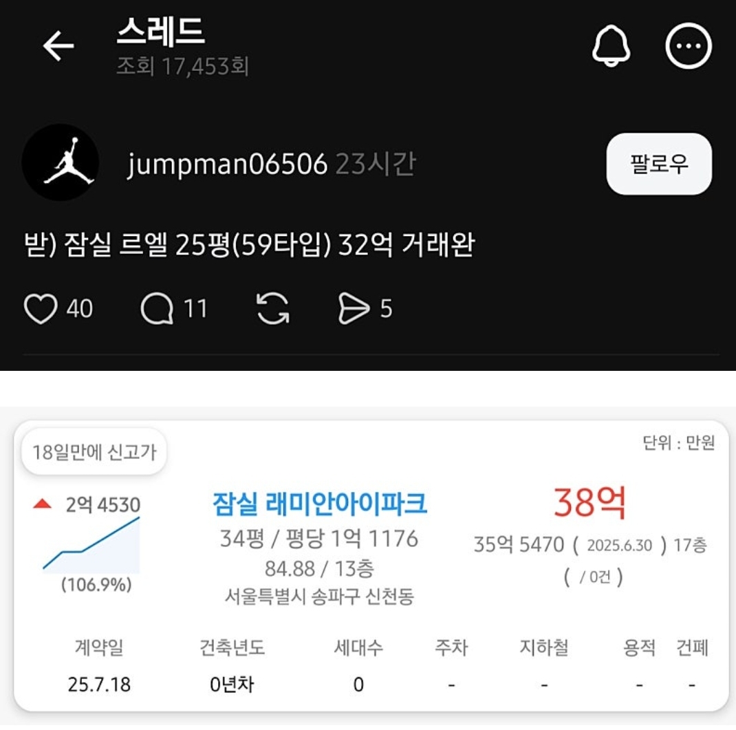 잠실 르엘 25평이 32억 원에 신고가 거래가 완료됐다. 단순히 높은 가격이 아니라 송파구 아파트 시장의 위상을 보여주는 상징적 사건이다. 불과 얼마 전 잠실 래미안 국평(전용 84㎡)이 38억 원에 거래된 바 있어, 이번 르엘의 실거래는 송파 대장급 아파트들의 가격 흐름을 더욱 공고히 한 셈이다.