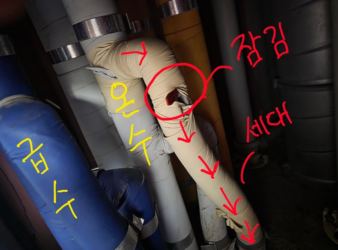 또 간혹 복도 피트공간(공용 배관실)에 있는 주황색이나 청색 메인밸브가 잠겨 있는 경우도 있다. 특히 최근 입주 단지에서는 시공사가 준공 직후 일부 밸브를 열지 않고 남겨둔 채 넘기는 사례가 있어서, 복도 쪽 밸브를 한 번 확인해보는 게 좋다.