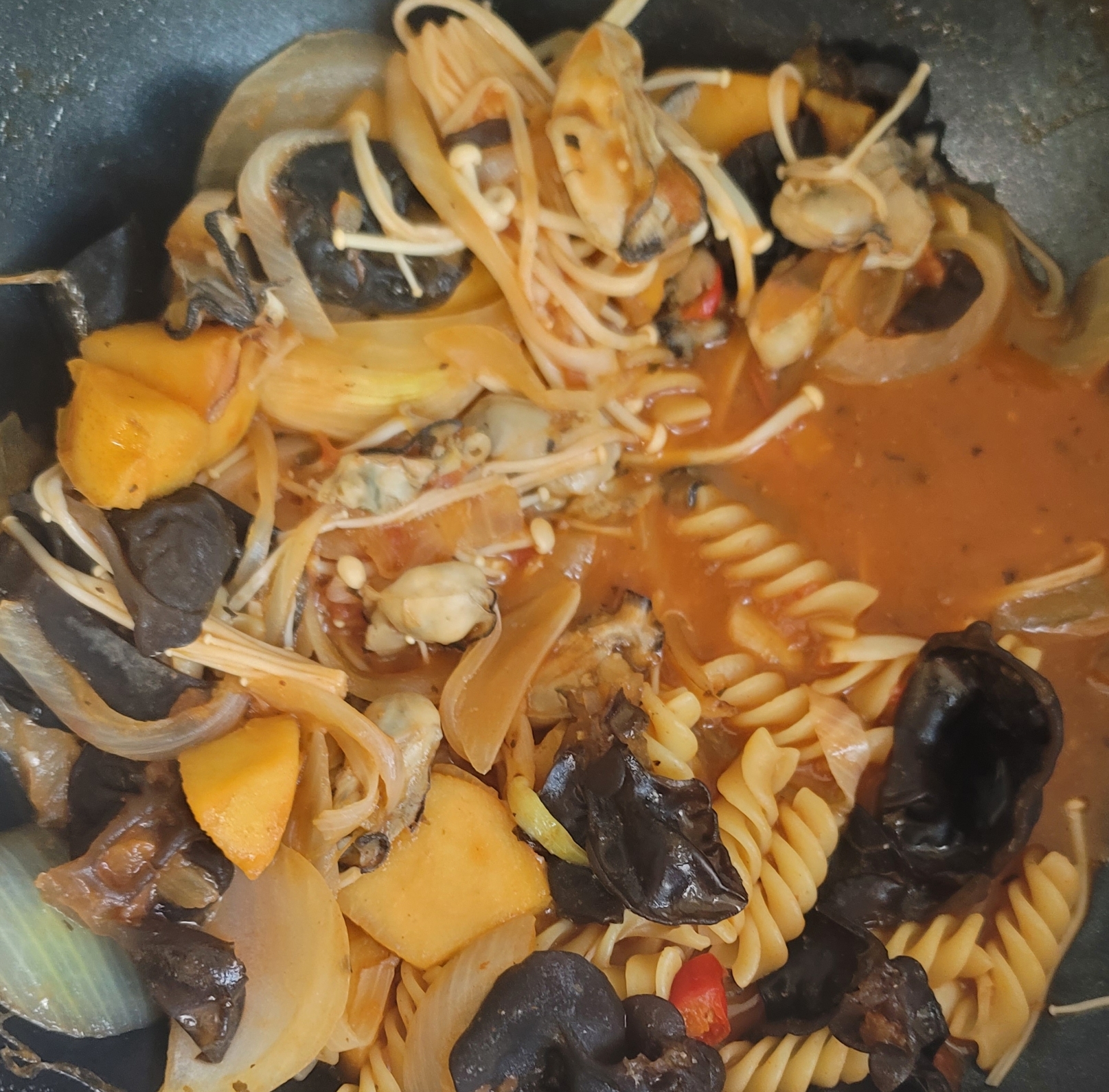 1. 푸실리 파스타에 굴, 버섯, 베트남고추, 토마토소스, 그리고 사과 한 개를 깍두기 썰기로 넣었다.