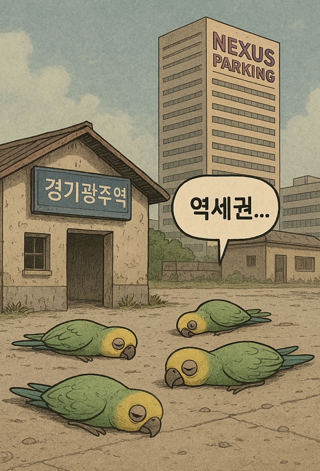 앵무새들이 쓰러져 있고 “역세권…”이라고 말하는 그림 하나로 분위기가 달아올랐다. 과장된 표현이지만 많은 사람이 공감했다. 이유는 단순하다. 경기광주역이 역세권이라고 하기엔 생활 편의가 충분하지 않다는 체감 때문이다.